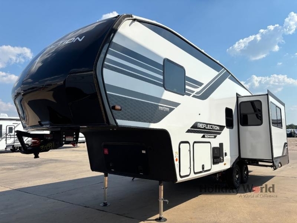 With any Reflection 150 Series fifth wheel by Grand Design, there is more available payload capacity and a broader range of half-ton trucks capable of towing this fifth wheel, and no slider hitch is needed thanks to the 90-degree turning radius which makes them short bed friendly and easier to tow. The mandatory Ultimate Power package provides a "One-Touch" automatic leveling system and a detachable power cord with LED light for easy setup, plus motion sensor pass-through lighting and entry lighting, and the Tire Linc TPMS will help you stay safe on the road. The interior offers residential luxury from the cabinetry and premium Congoleum flooring, to the booth dinette and residential-style window treatment. Make your refined decision today!