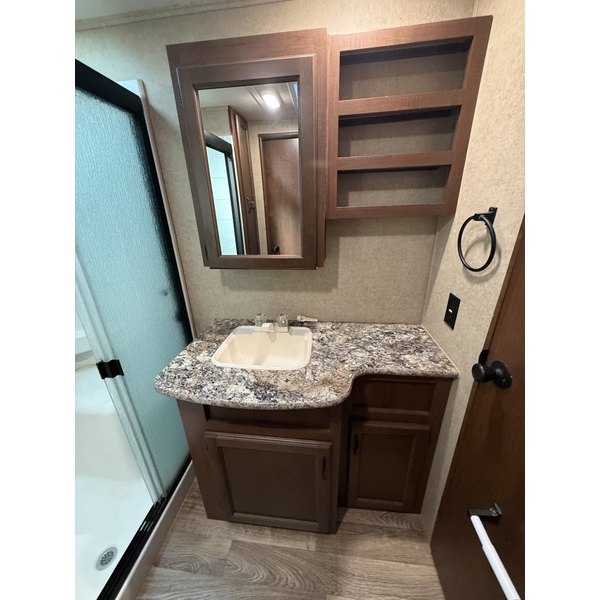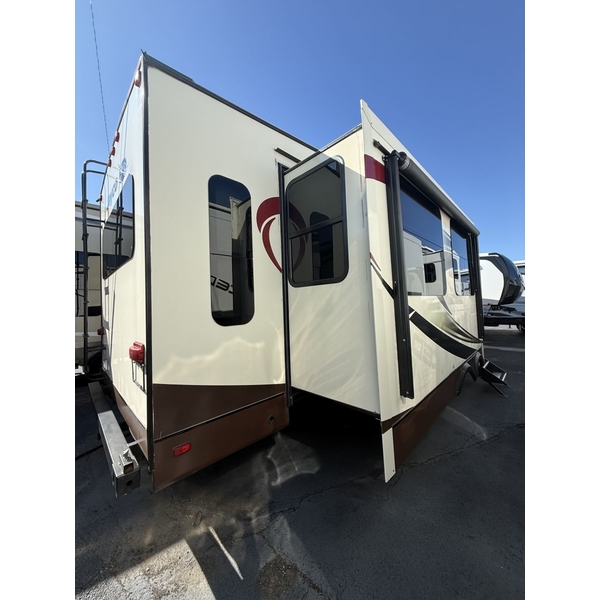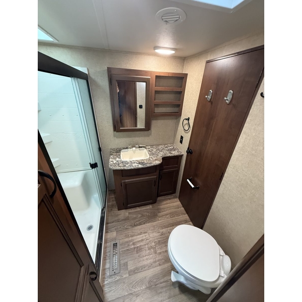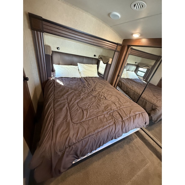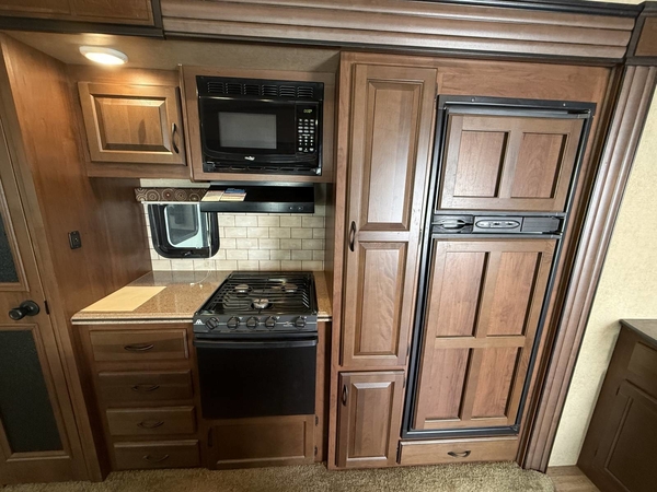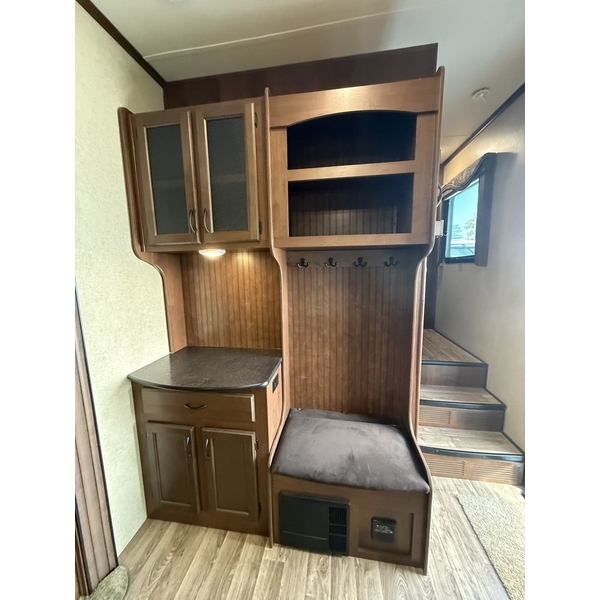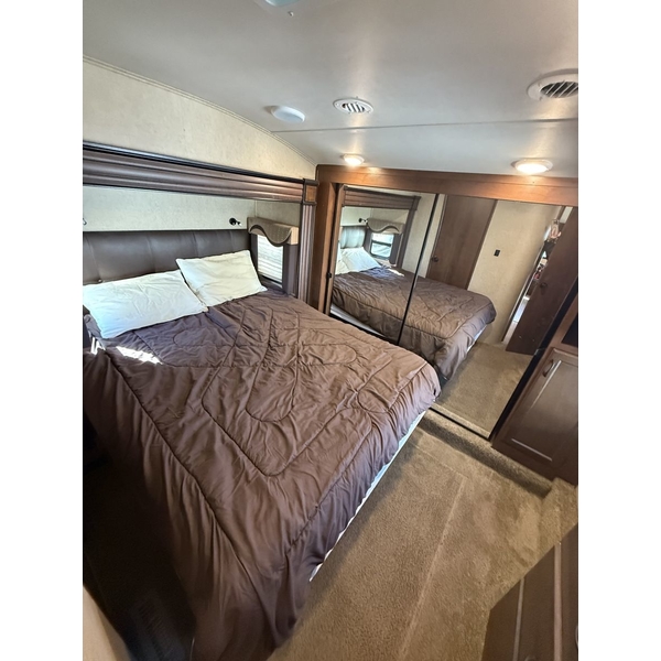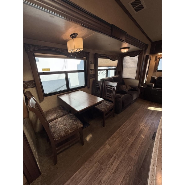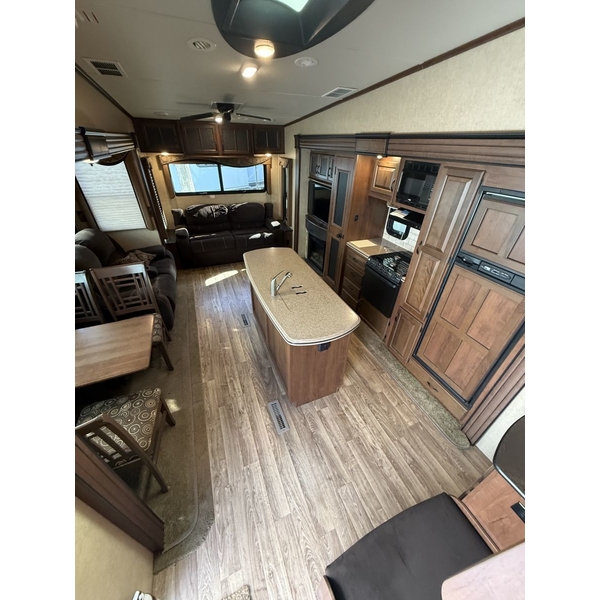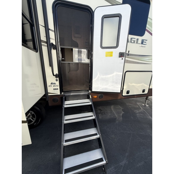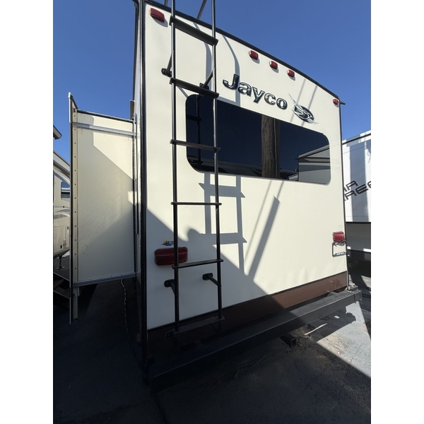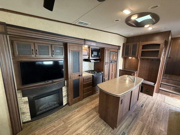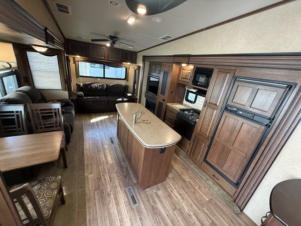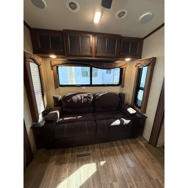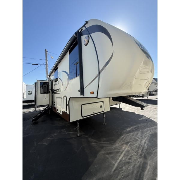 The 2015 Jayco Eagle 321RSTS is Jaycos best-selling fifth wheel floorplan, and for good reason. This well-designed RV offers a spacious and comfortable layout with triple slide-outs that create a wide-open living area, perfect for relaxing or entertaining. It sleeps up to 4 people comfortably, featuring a queen bed in the master suite and a large living area with a sleeper sofa. This particular unit is a one-owner RV, well-maintained and ready for its next adventure. With Jaycos reputation for quality and durability, the Eagle 321RSTS is an excellent choice for both weekend getaways and extended stays.