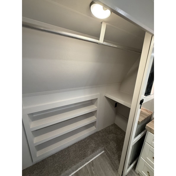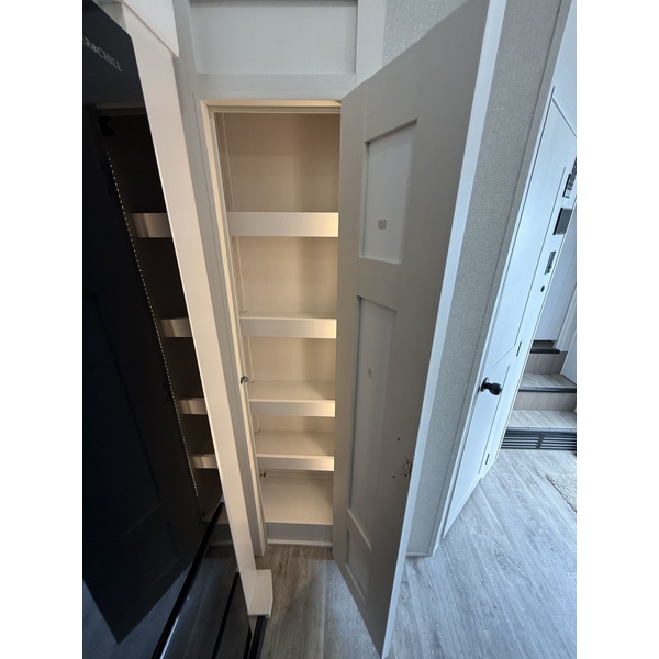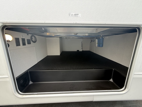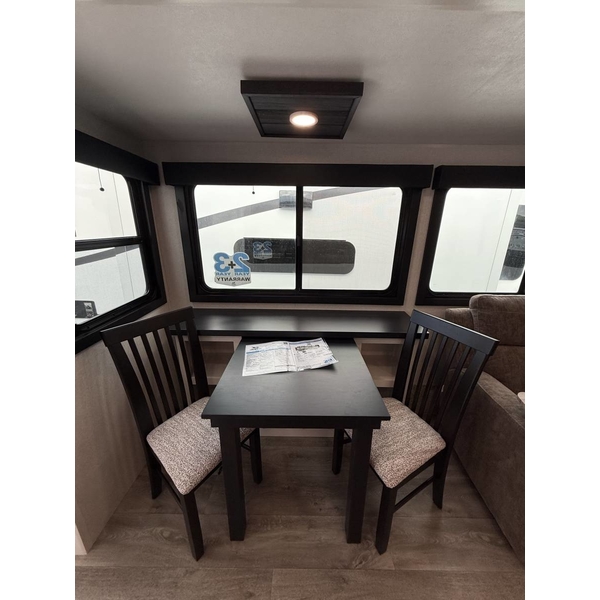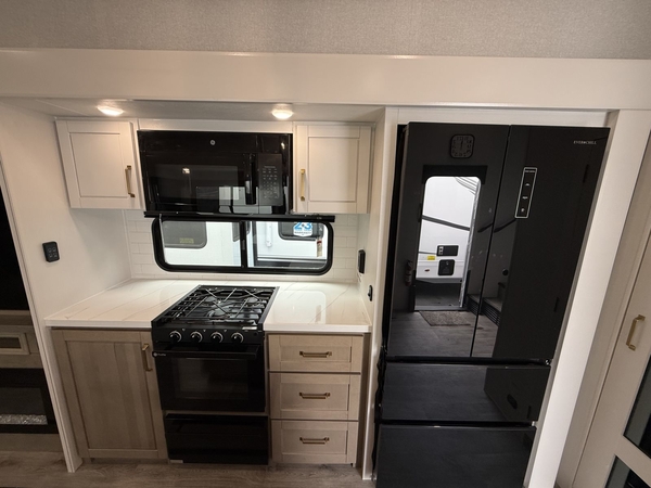The kitchen in the Eagle is designed for culinary exploration, featuring reliable GE appliances, including a stove with an edge-to-edge grate and an easy-to-clean oven. The innovative all-in-one sink serves multiple functions, offering versatility for both preparation and cleanup. Ready for outdoor cooking? The optional Halo Griddle is perfect for your adventures, featuring a windproof design, dual-zone burner, and a temperature range from 300 to 500 degreesperfect for grilling whatever inspires you. And when the weather shifts, the foldable dinette chairs and pivoting table with an outlet below let you quickly turn the indoor office space into a cozy dining area. Set the perfect ambiance with the "Blue Sync" audio system and MB Quart speakers, delivering high-quality sound for any setting.