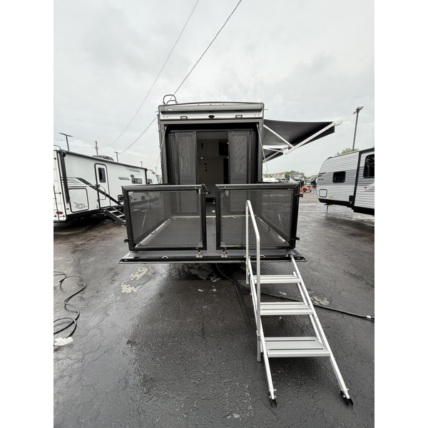 The garage is built for versatility, featuring HappiJac® electric-lift queen beds/convertible sofas, a Tuff-ply rubberized floor liner, and three-seasons removable wall/doors. Outdoor living is maximized with a rear ramp patio kit, anti-slip flooring, and a rear electric patio awning. Select models also offer an outside HALO griddle with JayPort® LP quick-connect.