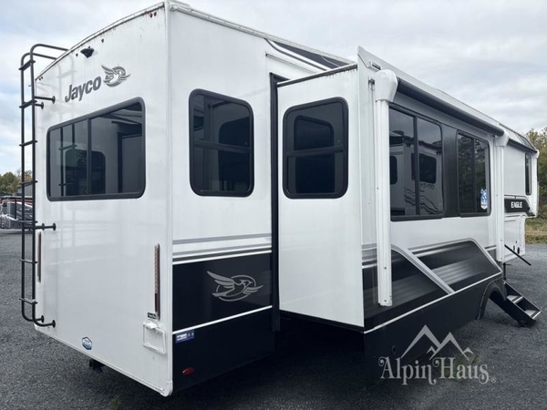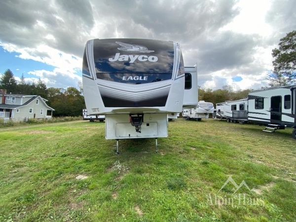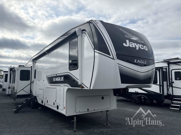 With any Eagle fifth wheel by Jayco you will appreciate durable construction materials, like the Magnum Truss Roof and the Stronghold VBL laminated walls. The JAYCOMMAND Smart RV system puts you in control of your RV's functions, and the 5 Star Handling Package will provide smooth towing from home to camp. Each model features Climate Shield zero-degree tested weather protection and the industry-exclusive HELIX cooling system that features two 15,000 BTU Whisper Quiet A/C's to keep you comfortable year around. Some of the exterior conveniences you are sure to love are the pass-through storage with Slam-Latch baggage doors and an automotive style front cap with max turn radius. The Eagle fifth wheels are designed to make you feel at home with solid hardwood slide fascia, residential vinyl flooring throughout, 100% no floor vents, and blackout roller shades with reflective side throughout for added privacy and insulation.