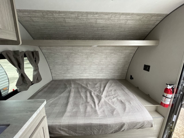 This lightweight travel trailer includes everything you need for comfortable camping trips at the lake. You can make your meals on the two burner cooktop or in the stainless steel microwave, and a 3.3 cu. ft. 12V refrigerator will keep leftovers fresh. A front queen bed provides a great night's rest, and there are 29" x 70" bunk beds for your guests or little ones. And a private bath with a 24" x 32" shower and toilet will let you easily freshen up without having to use the camp's facilities!