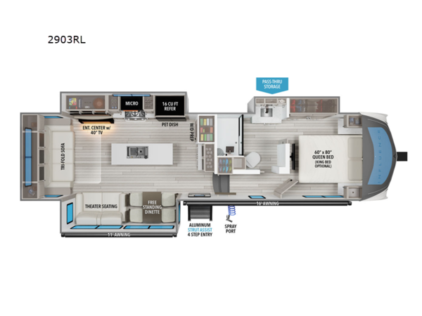 You'll feel right at home in this spacious fifth wheel with triple slides, a front master bedroom, and a kitchen island with extra counter space. The theatre seating is right across from the entertainment center which includes a 40" TV and fireplace, and there is a rear tri-fold sofa if you have any guests staying over. This model includes a hutch in the kitchen with cabinets above to store you nice dishes, plus there is a large pantry with washer and dryer prep if you plan to go full-time. Head to the dual entry bath that includes a linen closet and a spacious shower, and check out the front master bedroom with its queen bed, and slide out wardrobe. You can choose the optional king bed if you enjoy a bit more room in bed!