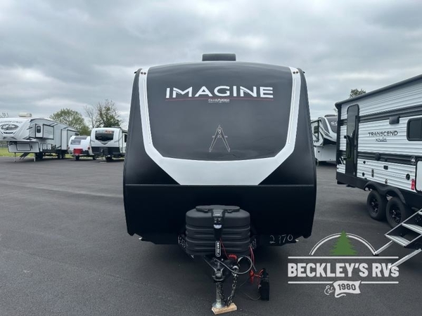 This Imagine travel trailer has opposing slides to provide you with ample living space on the interior once you've parked and set up! You can use the tri-fold sofa and theater seating to relax, and the booth dinette is another seating space that you can use for dinner time or game nights. The entertainment center has a LED HDTV with fireplace below, which is great for movie night.  When outside, you will love the two power awnings to sit beneath to keep you protected from the sun while you have fun at your campsite. The exterior also offers you an LP quick connect and a coax TV hookup.