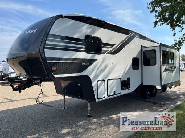 With any Reflection 150 Series fifth wheel by Grand Design, there is more available payload capacity and a broader range of half-ton trucks capable of towing this fifth wheel, and no slider hitch is needed thanks to the 90-degree turning radius which makes them short bed friendly and easier to tow. The mandatory Ultimate Power package provides a "One-Touch" automatic leveling system and a detachable power cord with LED light for easy setup, plus motion sensor pass-through lighting and entry lighting, and the Tire Linc TPMS will help you stay safe on the road. The interior offers residential luxury from the cabinetry and premium Congoleum flooring, to the booth dinette and residential-style window treatment. Make your refined decision today!
