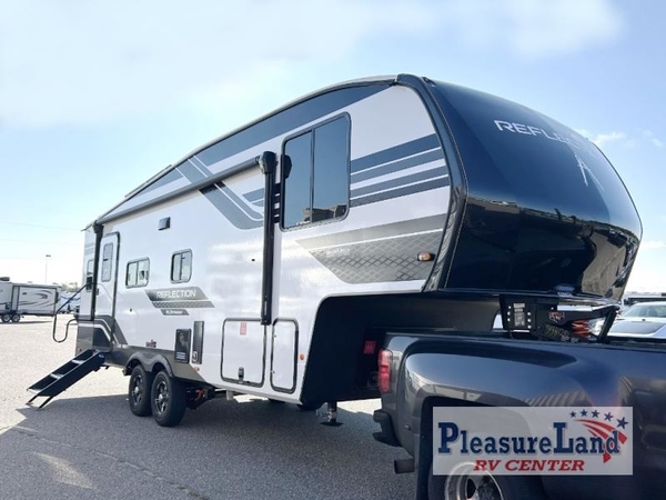 Feel right at home in this Reflection 150 Series with a private bedroom that includes a walk-around queen bed with storage on each side, windows, and a space savings sliding door. The full bathroom offers a walk-in shower, storage for your linens and a sliding door for easy access. When you get hungry, the cook will have an L-shaped kitchen area to make meals, plus full amenities including a 30" microwave, a flip-up counter extension, a pantry for your dry goods and a 16 cu. ft. refrigerator to store lots of food and cold beverages. You can dine at the rear U-shaped dinette lounge and enjoy the view out of all the windows or outside under the 18' electric awning. And the 78" theatre seating will be a nice place to relax and watch the 40" LED HDTV.