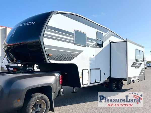 With any Reflection 150 Series fifth wheel by Grand Design, there is more available payload capacity and a broader range of half-ton trucks capable of towing this fifth wheel, and no slider hitch is needed thanks to the 90-degree turning radius which makes them short bed friendly and easier to tow. The mandatory Ultimate Power package provides a "One-Touch" automatic leveling system and a detachable power cord with LED light for easy setup, plus motion sensor pass-through lighting and entry lighting, and the Tire Linc TPMS will help you stay safe on the road. The interior offers residential luxury from the cabinetry and premium Congoleum flooring, to the booth dinette and residential-style window treatment. Make your refined decision today!