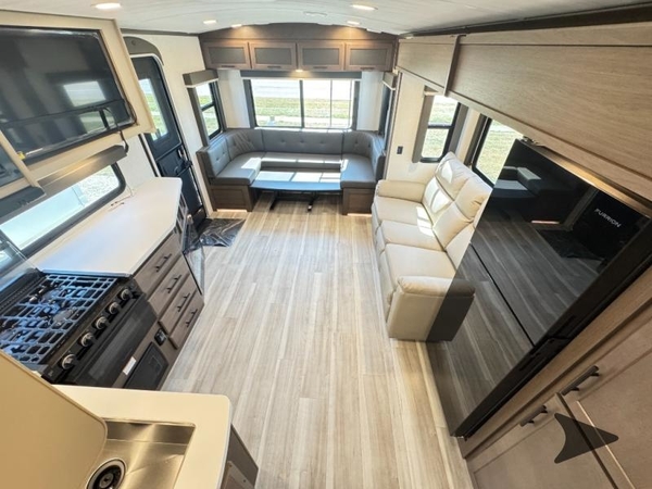 This Cougar Half-Ton travel trailer has an excellent dining area with its huge rear U-shaped dinette! Right next to the dinette is a large slide out that holds the tri-fold sleeper sofa, 12V refrigerator, and a pantry. The kitchen has been excellently appointed with a Furrion range, seamless, pressed countertops, a stainless steel undermount sink, and a microwave, and you will be grateful that you can access both sides of the walk-through bathroom. The private bedroom is ultra convenient with its exterior entrance, king-size bed, and dual storage drawers and dual nightstands.