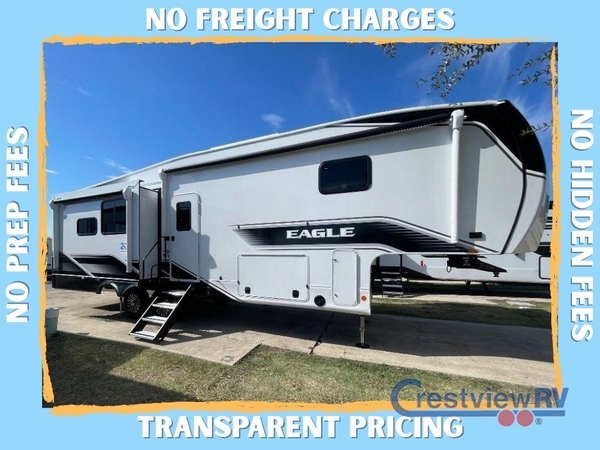 With any Eagle fifth wheel by Jayco you will appreciate durable construction materials, like the Magnum Truss Roof and the Stronghold VBL laminated walls. The JAYCOMMAND Smart RV system puts you in control of your RV's functions, and the 5 Star Handling Package will provide smooth towing from home to camp. Each model features Climate Shield zero-degree tested weather protection and the industry-exclusive HELIX cooling system that features two 15,000 BTU Whisper Quiet A/C's to keep you comfortable year around. Some of the exterior conveniences you are sure to love are the pass-through storage with Slam-Latch baggage doors and an automotive style front cap with max turn radius. The Eagle fifth wheels are designed to make you feel at home with solid hardwood slide fascia, residential vinyl flooring throughout, 100% no floor vents, and blackout roller shades with reflective side throughout for added privacy and insulation.
