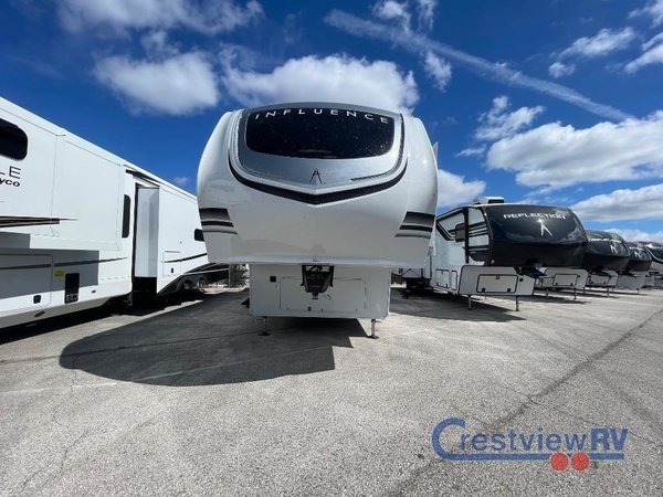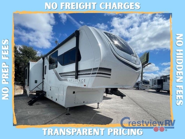 Any Grand Design Influence fifth wheel features five-sided aluminum cage construction with a walk-on roof and a fully enclosed underbelly with heated tanks and storage for all weather camping. For peace of mind, the MORryde CRE3000 Suspension system will provide safe and smooth towing, and the 101" widebody construction offers all the room you need and that is before multiple slides are fully engaged. You will appreciate the Keyed-Alike locks, slam-latch baggage doors with magnetic door catches, exterior security light, and SolidStep entry steps. On the inside, Congoleum flooring, premium roller shades for privacy, a hallway handrail for safety, and nightstands with USB ports to keep all of your electronics fully charged. You will also love the On Demand tankless water heater when showering, plus the added heat and ambiance from an electric fireplace, and so much more!