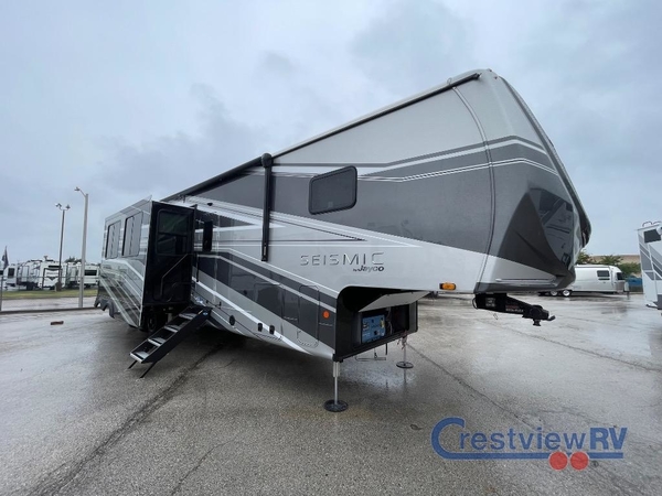 Take your outdoor adventures up a notch with this Seismic toy hauler. You can take the whole gang along for some fun with triple slides and dual entry for easy access going in and out. Your friends will sleep comfortably on the convertible sofas with overhead queen bed above in the 14' cargo garage space. There is also a storage space/loft above for their things and additional sleeping if needed. Inside, a full bath can be shared by all to get cleaned up each day, and all can gather inside in the spacious living area featuring dual opposing slides. Theater seating and an L-shaped tri-fold sofa create plenty of space for lounging. There is also a dining table for four inside and the second table in the garage area allows for more seating during meals inside when the weather isn't that nice. Two side awnings provide protection from the elements, along with a rear awning, and the rear ramp party deck with steps create even more outdoor living space to enjoy!