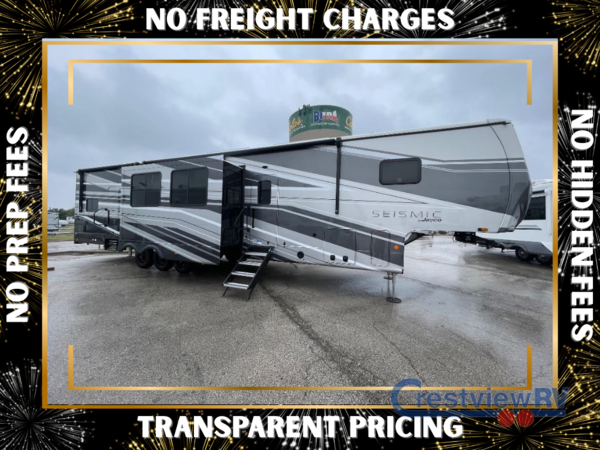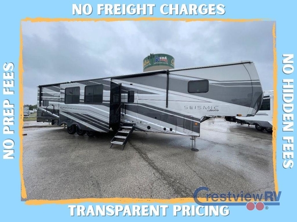 One look at the Seismic toy haulers by Jayco, and you'll never go back! Each model features a custom automotive-grade vinyl exterior graphics package, a painted fiberglass front cap with built-in LED lighting, and 102" wide-body structural steel I-beam construction. You'll find the pass-through storage with Slam-Latch baggage doors will make unpacking easier than ever, and the rear ramp door/patio with anti-slip, non-skid flooring will allow you to unload your toys with no trouble at all. These toy haulers feature a three seasons garage wall/doors, a 30 gallon fuel tank with a timer, and exterior marine-grade speakers to keep the party going. The Climate Shield zero degree tested weather protection includes a 35,000 BTU furnace, PEX plumbing, and a fully enclosed and heated underbelly so you can enjoy your adventures year around. And we haven't even touched on the interior luxuries you'll find, like solid hardwood cabinet doors, residential vinyl flooring made in the USA, night shades, and more!