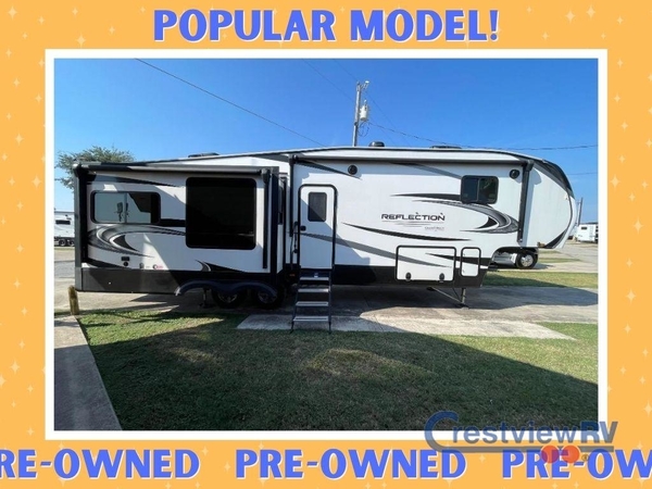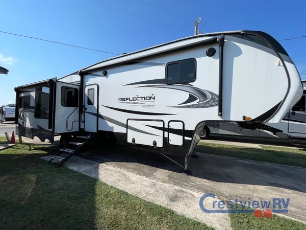 With any Reflection fifth wheels by Grand Design, you will have a 165W solar panel for off-grid camping and a 50 Amp charge controller and inverter prep, a Max Turn radius front cap for easy towing around town and into your campsite, a Universal All-In-One Docking Station, unobstructed pass-through storage, and Goodyear E-rated tires. Some other top features include a chef's kitchen with a 30" stainless steel microwave and residential cooktop, a USB charging station, and the ductless "Evenflow" heating system with no vents in the floor to collect debris. Each is constructed of high gloss gel coat exterior sidewalls, residential 5" truss rafters, walk-on roof decking, a fiberglass and radiant foil roof and front cap insulation plus laminated aluminum framed side walls, rear wall, roof and end walls in slide rooms. Choose luxury, value and towability over all the others, take home a Reflection of your good taste!