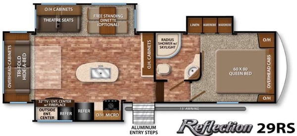 Across the rear wall of this Reflection unit you will enjoy a tri-fold hide-a-bed sofa with storage cabinets above to store more camping items. Adjacent, in the second living area slide out you will find theater seating for two and an optional free standing dinette instead of a booth dinette.