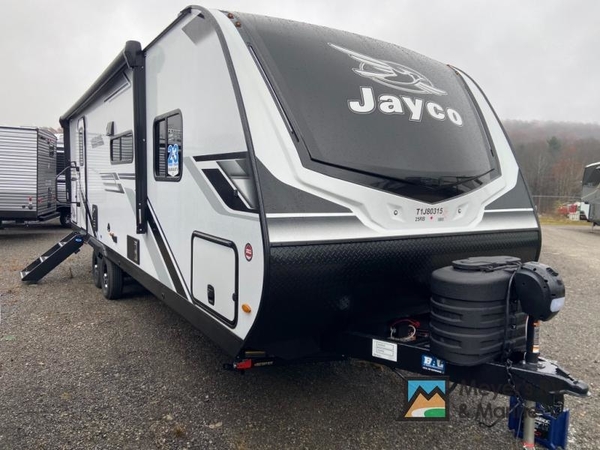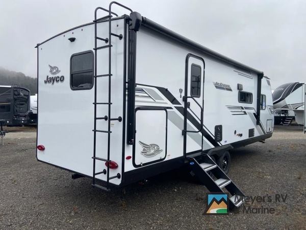 With any Jay Feather travel trailer by Jayco, you will enjoy lightweight towing, convenient exterior amenities, and at-home comforts inside! The Overlander 1 Solar Package included within the Jay Sport Package comes with a 200W solar panel and a 30-amp digital controller so you can enjoy some off-grid camping. There is also a modern graphics package with a dual-colored sidewall, LCI Solid Step fold-down aluminum tread steps on the main entry door, and Climate Shield 0 -100° F tested weather insulation package that will allow you to camp in all sorts of climates. The Customer Value Package will make time outdoors easier than ever with a power tongue jack and a Rock Solid stabilizer system, plus American-made nitro-filled Goodyear tires with self-adjusting electric brakes. More exterior features include a Keyed-Alike locking system, marine grade exterior speakers, a Magnum Truss roof system, and the list goes on! And we haven't even touched on the interior comforts, like the residential style seamless countertops and vinyl flooring throughout, decorative backsplash, handcrafted hardwood door/drawer fronts, and multiple USB charging ports to keep you going!