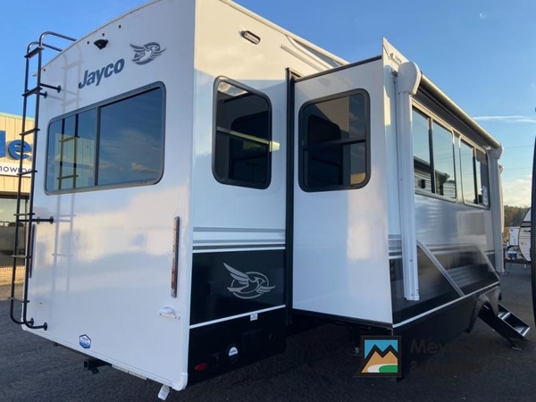 With any Eagle fifth wheel by Jayco you will appreciate durable construction materials, like the Magnum Truss Roof and the Stronghold VBL laminated walls. The JAYCOMMAND Smart RV system puts you in control of your RV's functions, and the 5 Star Handling Package will provide smooth towing from home to camp. Each model features Climate Shield zero-degree tested weather protection and the industry-exclusive HELIX cooling system that features two 15,000 BTU Whisper Quiet A/C's to keep you comfortable year around. Some of the exterior conveniences you are sure to love are the pass-through storage with Slam-Latch baggage doors and an automotive style front cap with max turn radius. The Eagle fifth wheels are designed to make you feel at home with solid hardwood slide fascia, residential vinyl flooring throughout, 100% no floor vents, and blackout roller shades with reflective side throughout for added privacy and insulation.