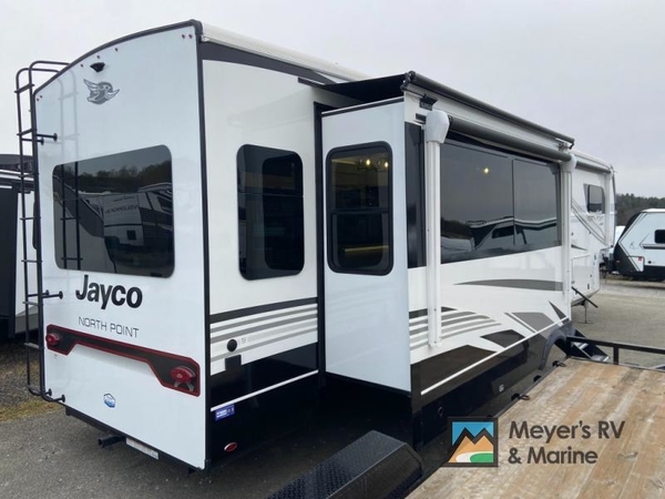 With any North Point fifth wheel by Jayco you begin with a strong foundation with a custom frame, designed and sized specifically to best support each unit. Constructed with Stronghold VBL aluminum framed, vacuum bond laminated walls and the Magnum Truss XL6 roof system with an Alpha roof membrane system, which is the strongest tested roof in the industry. The 5-Star Handling package is included with Uniroyal tires, a MORryde rubber pin box, Dexter axles with Nev-R-Adjust brakes, MORryde CRE-3000 rubberized suspension and wet bolt fasteners and bronze bushings. The interior has handcrafted hardwood glazed doors and drawers, vinyl flooring throughout, an integrated under-mount sink in the main bathroom, plus so much more you just have to see one to believe it all!