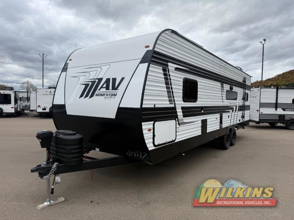 The Momentum MAV toy hauler travel trailers by Grand Design are designed to provide exactly what you need. The spacious garage provides tons of cargo space, with no wheel wells to get in the way. Additional storage includes magnetic storage door catches, and overhead consoles throughout. Conveniences like motion sensor lights and USB outlets will make your life easier, and you will be comfortable in all seasons with the 30K BTU furnace plus 15K BTU ducted air conditioning. The standard Solar Package comes with a 180W solar panel, a 40 Amp charge controller with Bluetooth, and a 12V refrigerator so you can go off-grid when the adventure calls for it.