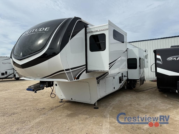 Each Solitude fifth wheel by Grand Design features a 101" wide-body construction, heavy duty 8,000 lb. axles, frameless tinted windows, and high-gloss gel coat sidewalls. You can camp year around thanks to the Weather-Tek Package that includes a 35K BTU high-capacity furnace, an all-in-one enclosed and heated utility center, and a fully enclosed underbelly with heated tanks and storage. Inside, you'll love the premium roller shades, hardwood cabinet doors, solid surface countertops, plus residential finishes throughout to make you truly feel at home. Each model also includes a MORryde CRE3000 suspension system, self adjusting brakes, and a MORryde pin box that will provide smooth towing from home to campground. Affordable luxury is possible with the Solitude fifth wheels; choose yours today!