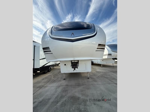 Grab the whole gang and head out in this fifth wheel featuring two private bedrooms, two full baths, and quad slides for even more space in this widebody layout. The living area featuring dual opposing slides offers space to dine and relax including an L-shaped sofa with recliners opposite the entertainment center and fireplace. You'll also love the full kitchen with ample counter space, a spice rack above the microwave, a pull-out pet dish, and more convenient features. The front master bedroom includes a queen bed with an optional king bed, a private entrance into the dual entry bath, plus a slide out with the wardrobe and bath sink. And your guests can take the second master bedroom with a folding queen bed slide, washer and dryer prep, a full rear bath, and even a loft above for more sleeping space!