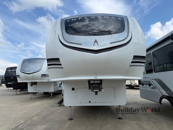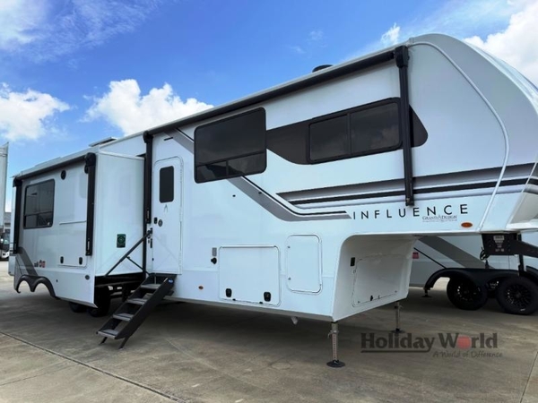 Any Grand Design Influence fifth wheel features five-sided aluminum cage construction with a walk-on roof and a fully enclosed underbelly with heated tanks and storage for all weather camping. For peace of mind, the MORryde CRE3000 Suspension system will provide safe and smooth towing, and the 101" widebody construction offers all the room you need and that is before multiple slides are fully engaged. You will appreciate the Keyed-Alike locks, slam-latch baggage doors with magnetic door catches, exterior security light, and SolidStep entry steps. On the inside, Congoleum flooring, premium roller shades for privacy, a hallway handrail for safety, and nightstands with USB ports to keep all of your electronics fully charged. You will also love the On Demand tankless water heater when showering, plus the added heat and ambiance from an electric fireplace, and so much more!