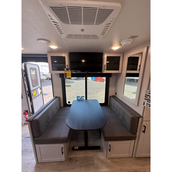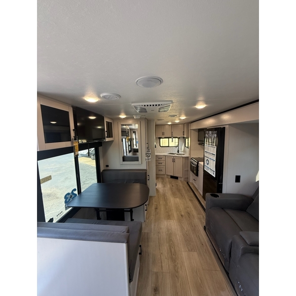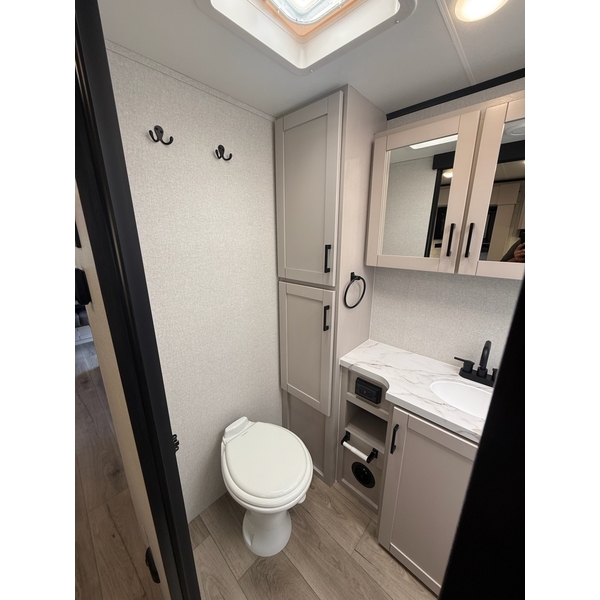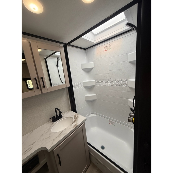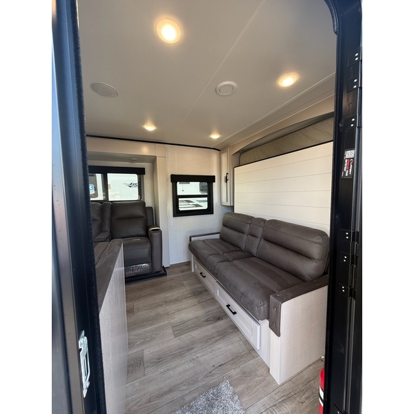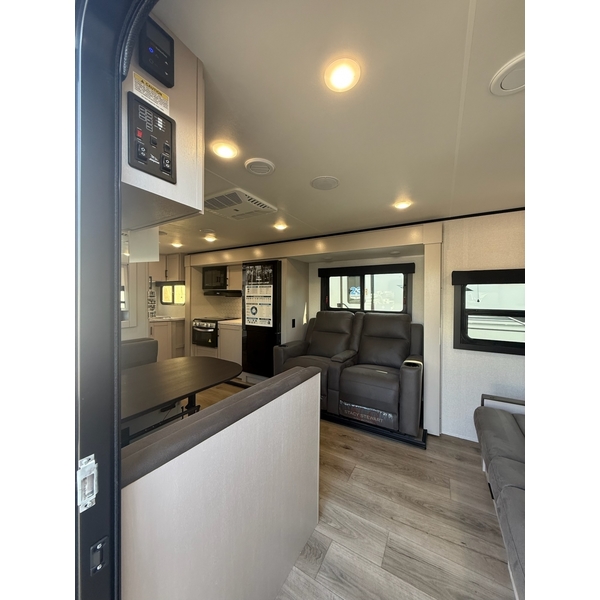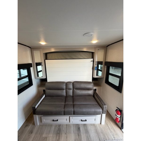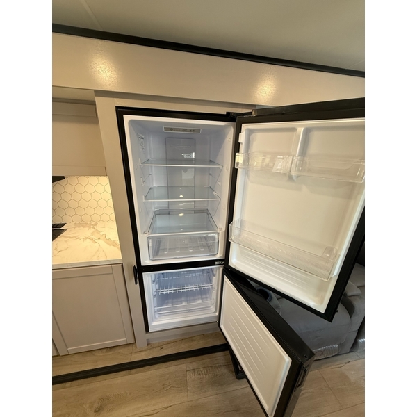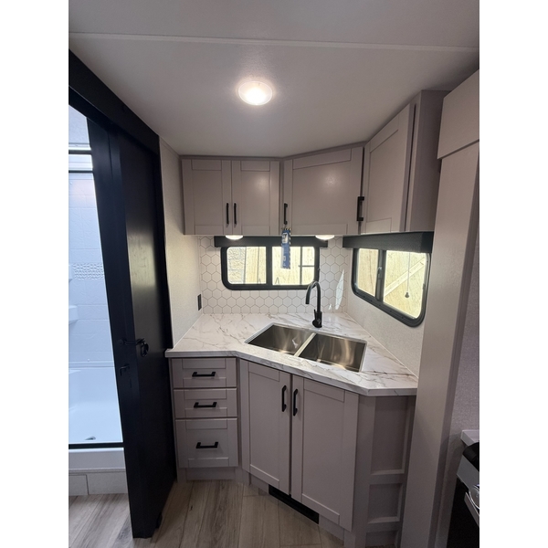 The amenities for 2026 dont stop there! In the kitchen area, you'll find seamless countertops throughout, a stainless-steel sink with a large window. You'll also be blown away by the all-new InVision Suite appliance package with an 11 cu. ft. 12V fridge, standard in all Jay Feather models. This fridge has a shiny, black glass front with a two-door fridge over the freezer. Store more on the go with oversized cabinet doors and drawers. The cabinet doors are attached with hidden hinges to give each Jay Feather that sought-after residential look and feel.