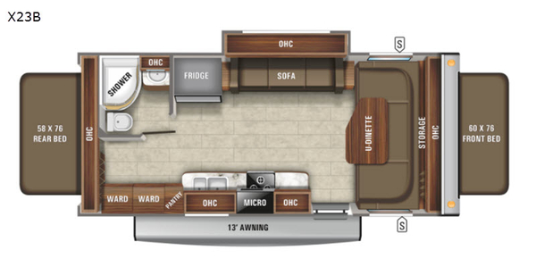 Get ready for some family fun outdoors with inside accommodations only steps away up the aluminum-tread entry steps. You will be able to dine at the U-shaped dinette up front as well as two can sleep here once the dinette is set up for nighttime. The sofa slide offers more floor space as well as a great place to relax and even eat. The chef will have a three-burner recessed cooktop and microwave to make their famous meals and a 6 cu. ft. refrigerator to hold the drinks and cold ingredients. Everyone can store their clothing in the two wardrobes and grab their clothes before entering the rear corner bathroom to shower. At night the front 60" x 76" and the rear 58" x 76" tent end beds on the Stronghold vacuum-bonded bed platforms with 1,050 lb. weight rating offer a secure and comfortable place to sleep above ground.