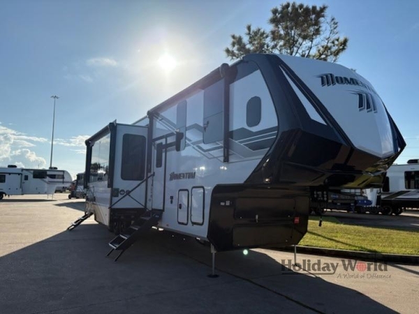 With any Momentum M-Class toy hauler by Grand Design, you will enjoy luxury at every turn! They have been constructed to a superior standard with a thermal roof design, triple insulated main floor and garage floor, and a Rail-Tite underbelly seal that will allow you to camp in all elements. Each model also features an 8' 5" wide body chassis with a wide rail design, no wheel wheels, and a dovetail entry for easier loading. The Stealth A/C system provides maximum cooling power, and the CRE3000 suspension system means you can enjoy a smooth tow each time. You will love the luxurious interior with a professional grade stainless steel cooktop, interior color changing LED accent lighting, a fiberglass shower with a glass door, and solid surface countertops.