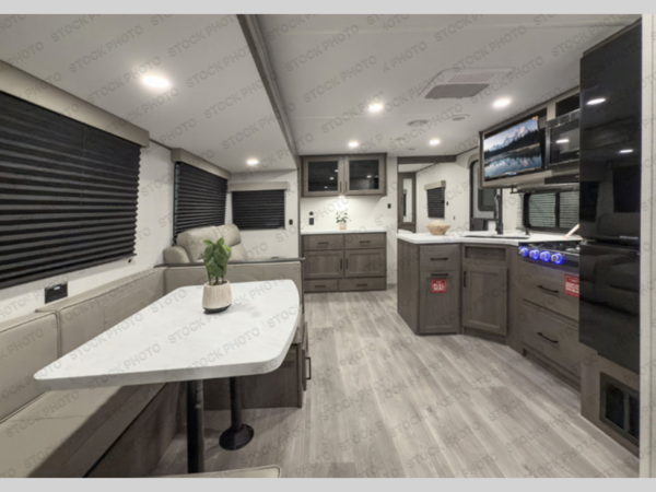 If you're looking for a travel trailer that can house your whole gang, this unit is the one! The rear private bunkhouse can sleep up to five since there is a sleeper sofa and three bunks, plus there are storage drawers for your guests' things. A front private bedroom will be perfect for the owners with a queen bed, storage space, and a convenient laundry chute! Whether you cook outside on the exterior griddle or inside on the three burner range, you'll be able to make your best meals. There is also a 12V French door refrigerator with a glass front and bottom freezer and a convection microwave/combo air fryer for easy meals! A U-shaped dinette and 60" sleeper sofa within the living room slide provides even more seating and sleeping space, or you can choose the optional theater seat in place of the sofa if you're not needing the extra sleeping space!