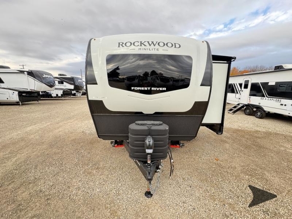Each Rockwood Mini Lite travel trailer by Forest River is constructed with a fully laminated one-piece walkable roof, sleek frameless windows, and a six-sided full aluminum frame for strength and durability. The 12V thermostatically controlled heated tanks, plus radiant foil in the underbelly will allow you to camp well into the colder months, and the 200W roof solar panel will be perfect for a little off-gridding. Each model includes solid surface kitchen countertops, hidden hinge cabinet doors, roller shades, plus many more interior features. Having an AIR 360+ omnidirectional antenna with WiFi prep on board gives you the option to get some work done if it's needed, and the power tongue jack provides hassle-free set up, so you can enjoy more time relaxing!