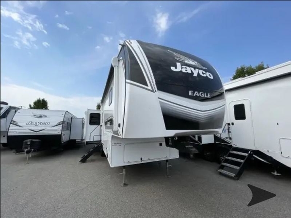 With any Eagle fifth wheel by Jayco you will appreciate durable construction materials, like the Magnum Truss Roof and the Stronghold VBL laminated walls. The JAYCOMMAND Smart RV system puts you in control of your RV's functions, and the 5 Star Handling Package will provide smooth towing from home to camp. Each model features Climate Shield zero-degree tested weather protection and the industry-exclusive HELIX cooling system that features two 15,000 BTU Whisper Quiet A/C's to keep you comfortable year around. Some of the exterior conveniences you are sure to love are the pass-through storage with Slam-Latch baggage doors and an automotive style front cap with max turn radius. The Eagle fifth wheels are designed to make you feel at home with solid hardwood slide fascia, residential vinyl flooring throughout, 100% no floor vents, and blackout roller shades with reflective side throughout for added privacy and insulation.
