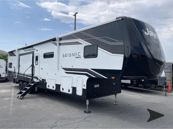 One look at the Seismic toy haulers by Jayco, and you'll never go back! Each model features a custom automotive-grade vinyl exterior graphics package, a painted fiberglass front cap with built-in LED lighting, and 102" wide-body structural steel I-beam construction. You'll find the pass-through storage with Slam-Latch baggage doors will make unpacking easier than ever, and the rear ramp door/patio with anti-slip, non-skid flooring will allow you to unload your toys with no trouble at all. These toy haulers feature a three seasons garage wall/doors, a 30 gallon fuel tank with a timer, and exterior marine-grade speakers to keep the party going. The Climate Shield zero degree tested weather protection includes a 35,000 BTU furnace, PEX plumbing, and a fully enclosed and heated underbelly so you can enjoy your adventures year around. And we haven't even touched on the interior luxuries you'll find, like solid hardwood cabinet doors, residential vinyl flooring made in the USA, night shades, and more!