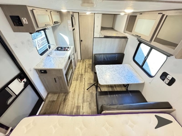 After making dinner on the two burner cooktop or inside the microwave, you can dine at the booth dinette or outside under the 8' power awning if you brought along your camping chairs. Either way you will be comfortable and the dinette may even sleep one person if needed. After playing outdoors all day, everyone can return to get cleaned up in the private toilet and shower room then fall asleep on the queen bed up front or the bunk beds in the rear. And everyone can wake up the next morning to do it over again.
