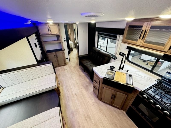You'll love every minute spent in this single slide out travel trailer, whether you're cooking dinner on the outside kitchen or in the rear kitchen, relaxing on the sofa across from the fireplace, or sleeping on the RV king bed in the front master bedroom! There are hidden shelves behind the fireplace for convenient storage, and the booth dinette within the slide provides a place to dine together. The walk-thru bath is spacious, and includes a tub/shower, toilet, and sink with counter space.