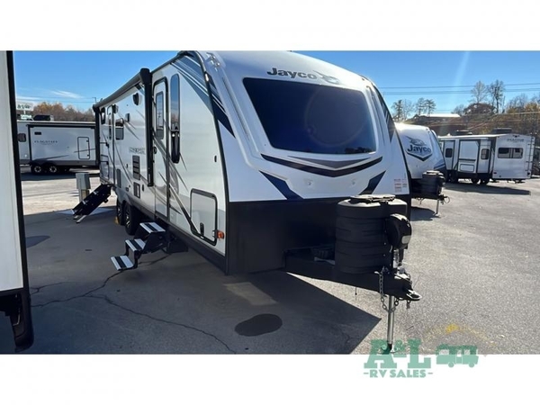The lightweight White Hawk travel trailers by Jayco will blow you away with their roomy interiors, luxurious amenities, and durable construction. The Magnum Truss Roof System can withstand 50% more weight than the competition, and the Stronghold VBL lamination is the lightest, yet strongest in the industry. Each model includes the JAYCOMMAND "Smart RV" system with a tire pressure monitor system, plus American-made Goodyear tires for maximum durability and carrying capacity. You will love the sleek look of the front molded fiberglass cap with an automotive windshield and blue LED accent lighting, along with the frameless windows and automotive-style aluminum rims. The White Hawk travel trailers also include an arched interior ceiling, a kitchen skylight with a shade, residential vinyl flooring with cold crack resistance, and an electric fireplace.