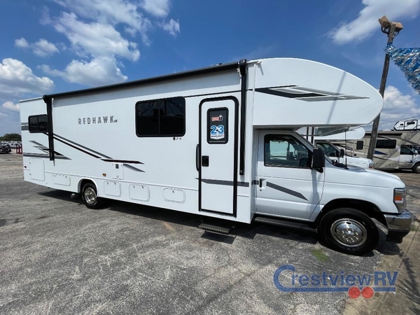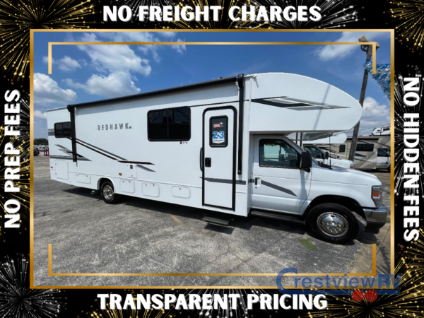 Experience easy living in any one of these Jayco Redhawk SE Class C gas motorhomes! They are built with a Stronghold VBL lamination which is the lightest and strongest construction in the RV industry. The one-piece seamless front cap which helps to resist wear and tear, the Ford E-450 chassis, and the 7.3L V8 325 HP engine shows these units are built to last for years to come. The mandatory Customer Value package includes an electric patio awning to protect you rain or shine, an LED HD Smart TV, and a backup camera to make parking and maneuvering easier. You will also love your options that include automatic hydraulic leveling jacks and an optional 200W solar panel with a dual controller and second house battery for off-grid capabilities!