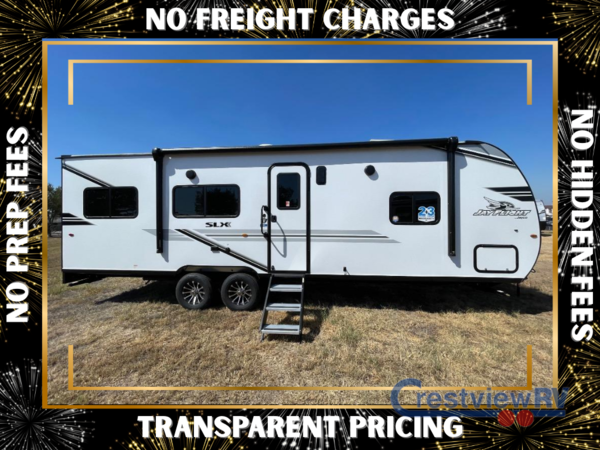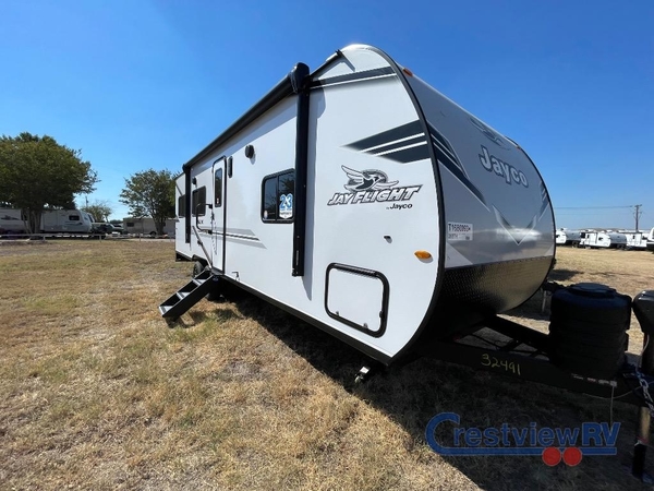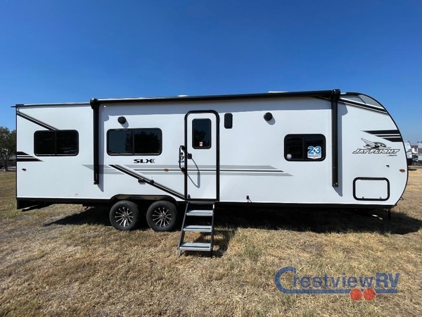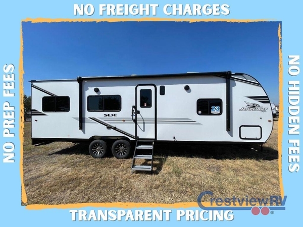 The Jayco Jay Flight SLX toy hauler travel trailer is quite easy to own because it is lightweight for an easier towing experience. Built on a fully integrated A-frame with galvanized-steel, impact-resistant wheel wells, the Jay Flight SLX has quality at its very foundation. That quality continues on to the electric self-adjusting brakes, easy-lube hubs, Magnum Truss roof system, and LP quick connect. Some of what the mandatory Customer Value Package includes is backup camera prep, Keyed-Alike entry and baggage doors, and an on-demand tankless water heater.