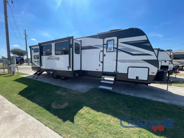 A great travel trailer for larger families or those that enjoy traveling with a few friends! This Imagine quad bunk model features two private bedrooms, with the master up front including a private entry/exit door just beyond a spacious walk-through bathroom that features a 30" x 36" shower with skylight to bring in more natural lighting each day, plus a toilet, sink and linen storage. In the kitchen, a nice island for food prep and cleaning up makes it easy to be part of the conversation in the room while you get meals ready for everyone. Speaking of food prep, how about the outside griddle and 1.6 cu. ft. refrigerator which is perfect for cooking outside, or for making late night snacks when all are enjoying the evening under the stars or in lawn chairs under one of two 9' 6" awnings with LED lighting. Your kids can bring along extra guests with the added sleeping that a quad bunk model provides. And, there is plenty of storage in the private bunkroom with drawers beneath for their things, plus a rear baggage door that is 42" x 22" for even more storage space for extra toys and gear.