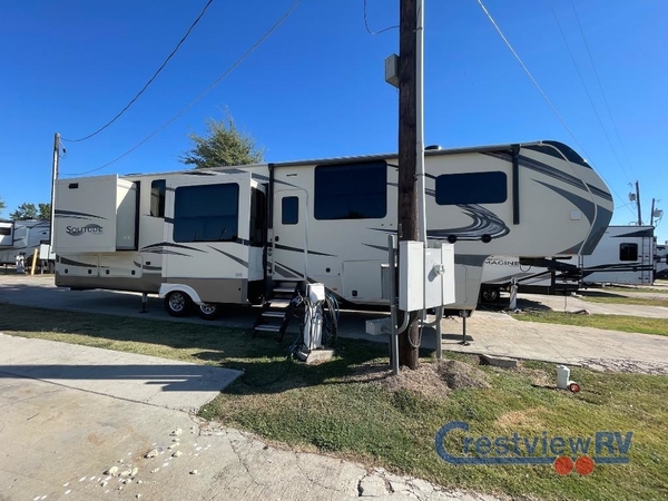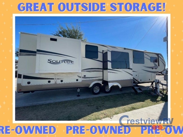 You will love your extended stays while traveling in this Solitude fifth wheel which features five slides! A rear raised kitchen provides the family chef a great space with opposing slides as well as an island for food prep. A raised bar top with two stools overlooks the center living space that also features dual opposing slides, two tri-fold sofas, and theatre seating. Dual sinks in the full bathroom means getting ready is easy for two, and the shower with skylight offers more head room that you are also sure to appreciate. As you wind down your day, the front master bedroom will be a welcomed retreat thanks to a queen bed slide with a pull-out ottoman to sit on when removing your shoes, and the walk-in closet provides ample space for all of your things. For added storage, a large exterior sliding tray offers more room for luggage and larger items. There is also a mid-coach pass-through storage compartment for other camping gear, and an optional pull-out kitchen and/or king bed option if you decide to change things up.