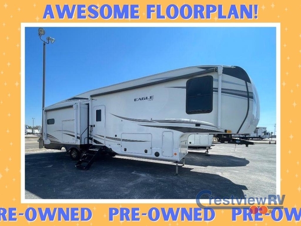 Start having generations of family fun with any one of these Jayco Eagle travel trailers and fifth wheels! Jayco has taken the extra steps to build high quality products that have the most advanced construction techniques with the StrongholdVBL vacuum-bond lamination that is the lightest yet strongest construction available in the RV industry. The Magnum Truss Roof System is 50% stronger than other roofs in the industry and are built to outlast everything but your memories with top-quality materials and innovative manufacturing techniques. There are three mandatory packages in addition to the long list of standard features to make each and every trip as enjoyable as it can be. A few of these features include a patent-pending Drinking Water System, an LED fireplace with 5,000 BTU electric space heater, MORryde® StepAbove entrance step with blue LED light, and an observation camera prep on the rear and sides. With Goodyear® Endurance® tires made in the U.S.A, Dexter® axles with Nev-R-Adjust® brakes and E-Z Lube® hubs, and a MORryde® CRE--3000 rubberized suspension, you will experience a smooth ride. Don't wait any longer, come choose your favorite one today!