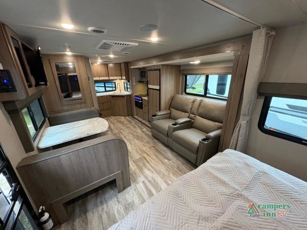 You and your spouse will love this spacious trailer with a large slide giving you lots of floor space to walk from the front to the back! The cook will enjoy the rear part of the kitchen with windows and a stainless steel sink, and the appliances are within the slide out next to the theatre seats with cupholders. The full bathroom will keep everyone refreshed before bedtime, the booth dinette offers a dining and gaming area indoors, and the privacy curtain can be closed to create a front bedroom at night. You will have a walk-around queen bed and your own side to put your clothing and such. The HD TV is on a swing-arm for easy viewing from the furniture or the bed. And you can enjoy relaxing outside under the electric awning on those beautiful evenings.