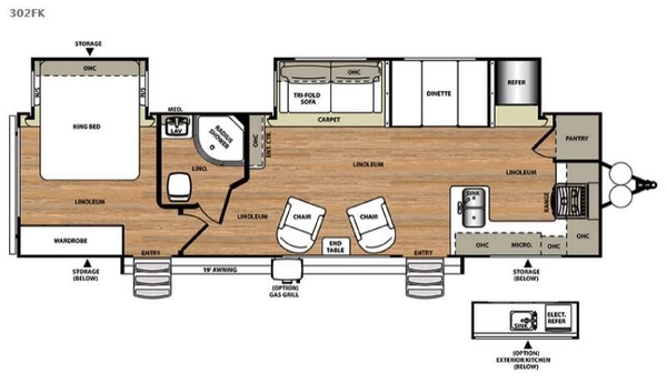 As you enter the travel trailer, to the left are two lounge chairs and an end table. Along the front of the trailer you will find the kitchen with a wrap around counter that has a double kitchen sink, lots of counter space, microwave, three burner range, and a large pantry. The slide has a refrigerator, dinette, and hide-a-bed sofa. Next to the sofa you will find an entertainment center.