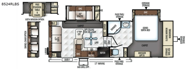 Outside you can choose an optional gas grill, as well as enjoy the shade of the 17' awning. The pass thru storage area and all of the exterior storage spots are great for all of your camping gear and more!