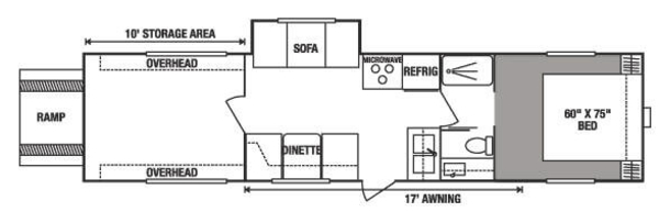 Single Slide, Rear Ramp to 10' Cargo Toy Parking Space w/Overhead Cabinets Both Sides, Wall & Door Separating Cargo From Living Area, Sofa Slideout, Booth Dinette, 3 Burner Range, Refrigerator, Double Kitchen Sink, Overhead Cabinets, Tub/Shower, Stool Room w/Lav., Front Queen Bed w/Wardrobes, Awning, Exterior Shower & Much More.