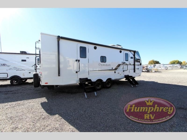 With a queen-size bed and a king bed option, this Cougar Half-Ton travel trailer shows that you can still be comfortable even while you're away from home! The bed slides out to provide more floor space and there is a wardrobe opposite near the private entry door. The main entry up front leads into a spacious combined kitchen and living area with the front kitchen offering plenty of counter space and overhead storage. There is a 12-volt refrigerator to the left of the entry door, and access to a walk-in pantry is right around the corner from the pivoting entertainment center opposite a tri-fold sofa sleeper and booth dinette slide. This unit also features a full-width walk-thru bath giving you plenty of room to shower and change.