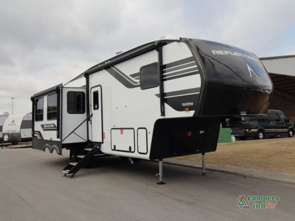 The Reflection 303RLS is constructed with high-gloss gel coat sidewalls, residential 5" truss rafters, walk-on roof decking, fiberglass and radiant foil insulation, and laminated aluminum-framed slide rooms. Inside, youll find residential hardwood cabinet doors, premium Congoleum flooring, and a spacious glass-enclosed shower, creating a refined and comfortable living experience that truly feels like home.
