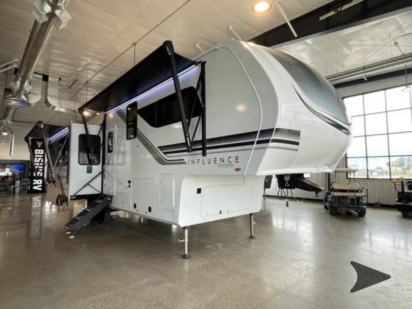 Any Grand Design Influence fifth wheel features five-sided aluminum cage construction with a walk-on roof and a fully enclosed underbelly with heated tanks and storage for all weather camping. For peace of mind, the MORryde CRE3000 Suspension system will provide safe and smooth towing, and the 101" widebody construction offers all the room you need and that is before multiple slides are fully engaged. You will appreciate the Keyed-Alike locks, slam-latch baggage doors with magnetic door catches, exterior security light, and SolidStep entry steps. On the inside, Congoleum flooring, premium roller shades for privacy, a hallway handrail for safety, and nightstands with USB ports to keep all of your electronics fully charged. You will also love the On Demand tankless water heater when showering, plus the added heat and ambiance from an electric fireplace, and so much more!