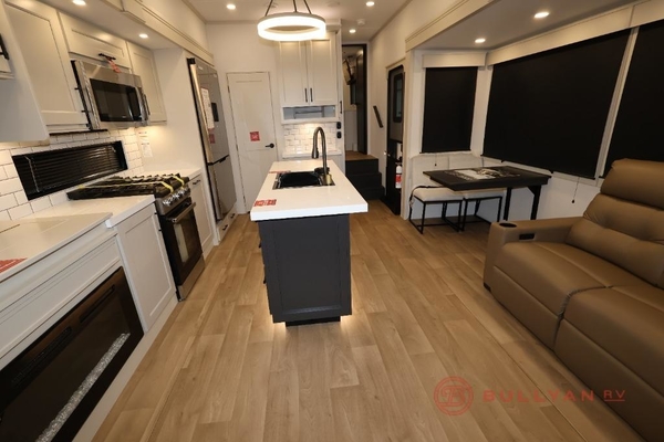 Traveling for long periods at a time is made easy with this gourmet kitchen that can feed your entire group a holiday meal! The professional-grade stainless steel cooktop with a built-in oven, microwave, 12V 20 cu. ft. refrigerator, and a kitchen island offers everything you will need to enjoy cooking for your family and guests. There is abundant storage throughout multiple overhead cabinets, a kitchen pantry and hutch, a bath linen cabinet for your towels, and in the front master bedroom which features a large closet. In the bedroom there is also a queen bed slide for added space to sleep comfortable at night, or you may choose an optional king bed if you enjoy more space. You will also find a closet with washer/dryer prep, large wardrobe, a clothes hamper plus a slide top dresser. Two nice awnings will provide outdoor living space keeping you protected from the sun and rain, and you can add an optional pull-out kitchen to enjoy convenient cooking outdoors as well.