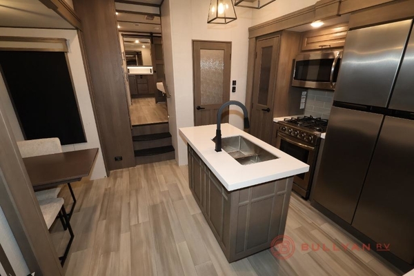 Five slide outs, a full bathroom with dual sinks, a half bath off of the kitchen, and a separate front living room and entertainment area are a few reasons you will enjoy your time spent in this fifth wheel! The separate kitchen is a dream with stainless steel appliances including a 24" residential oven, a pantry and hutch with counter space, a kitchen island plus a free-standing dinette slide with windows for great views. The entertainment center offers an LED Smart TV with a fireplace below and storage, and the dual opposing tri-fold sofas provide added sleeping space at night. The master bedroom includes a queen bed, LED TV and storage, plus space savings sliding doors that lead you to the rear full bathroom with dual sinks, linen storage, and space prepped for a washer/dryer option. You will find more storage throughout the fifth wheel in the overhead cabinets, the entry closet, and even your shoes have a spot under the interior steps leading to the front living/entertainment room. The exterior has several storage choices as well including a pass-through compartment for fishing poles and such, plus the unique sliding tray in the rear allows you to bring along larger items such as camping tables, portable grills, golf clubs, totes and more.
