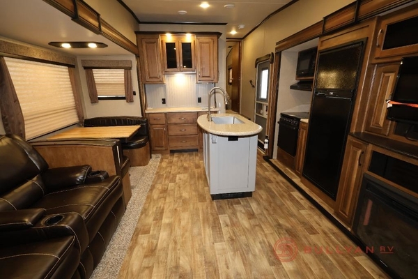 Back down on the main level find a kitchen area with countertop and overhead storage space along the interior living area wall. There is a convenient kitchen island with a large sink and counter prep space. The first slide out is along the entrance door wall including a three burner range with convection microwave above, a refrigerator, and an entertainment center with a 40" TV plus a fireplace.